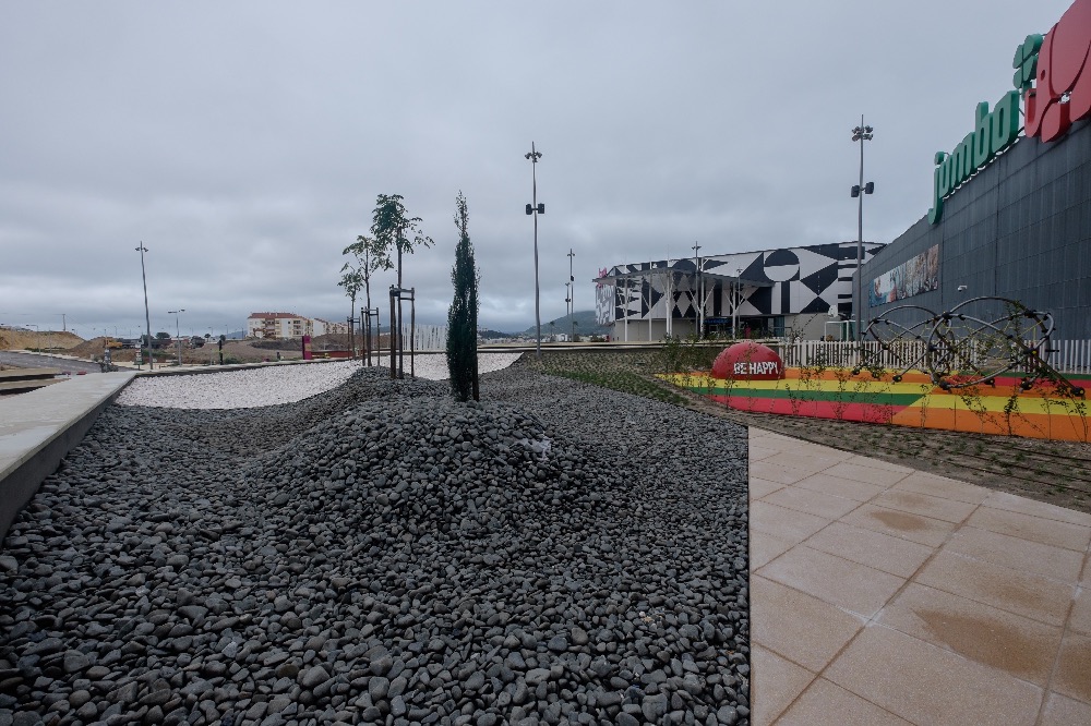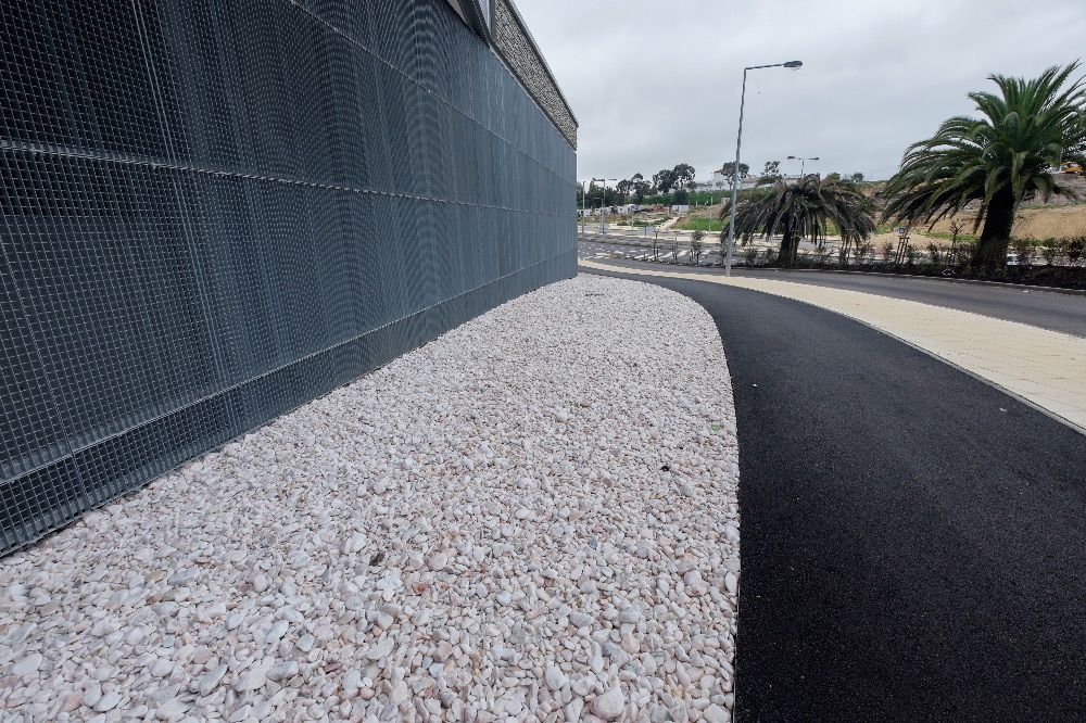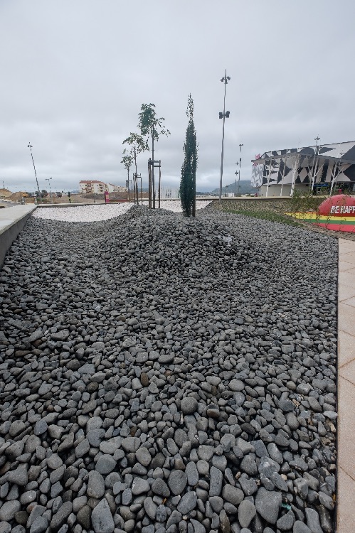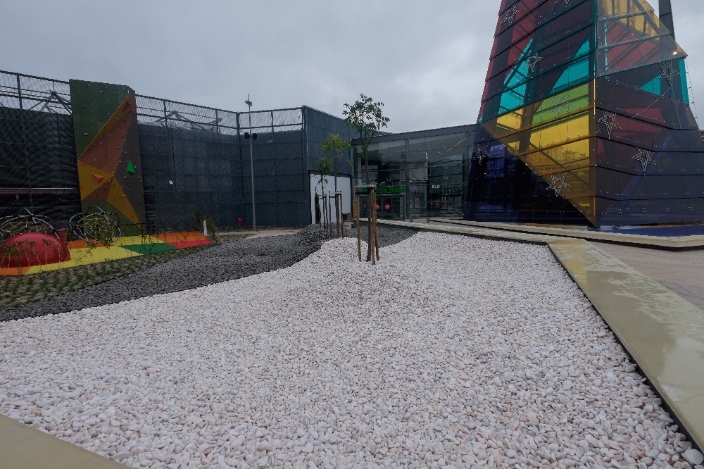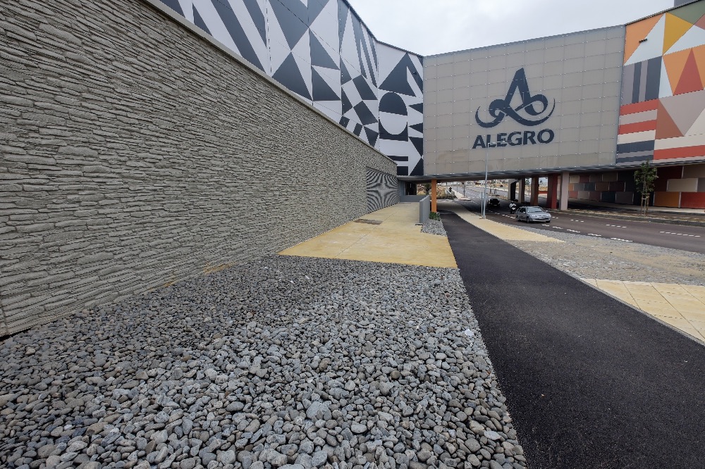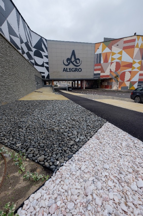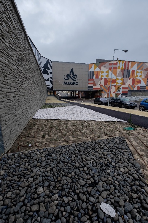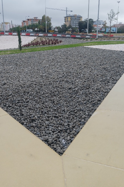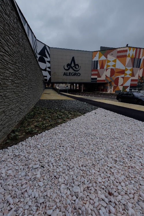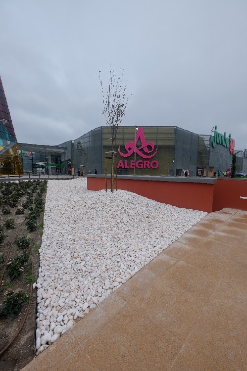 Recente Projeto fornecido para Centro Comercial Alegro shopping em Setúbal, perto de 320 toneladas de seixo rolado em Estremoz e Basalto (pedra preta) calibre-tamanho pedra referência 5/8 que serviu para revestir toda área circundante do edifício, espaços de jardim.