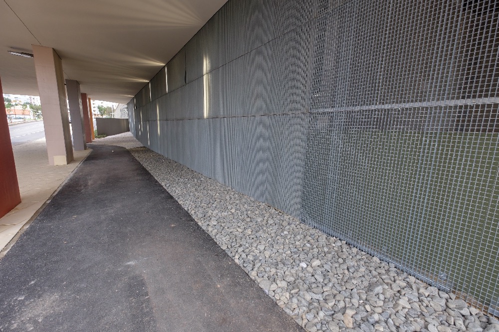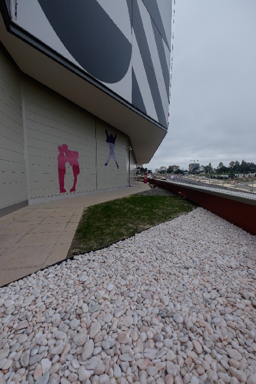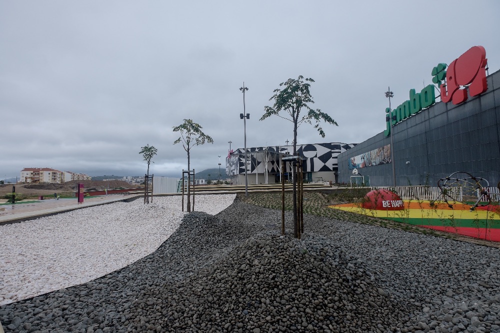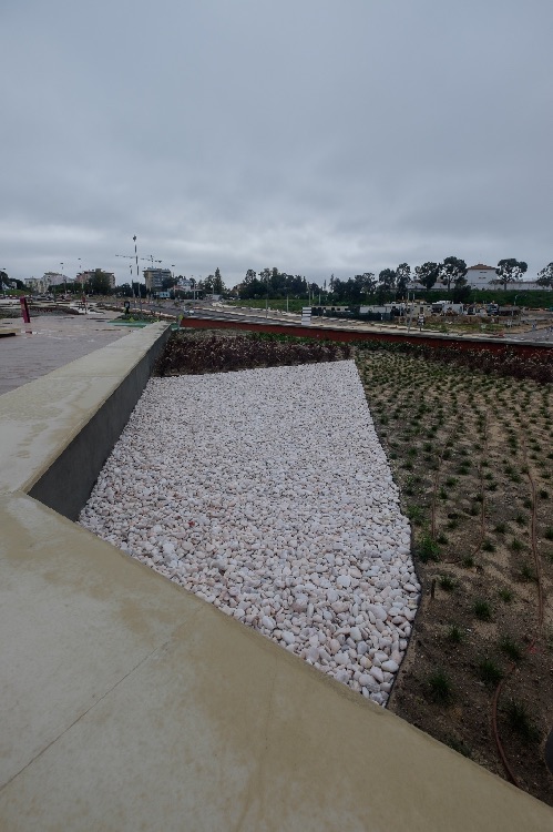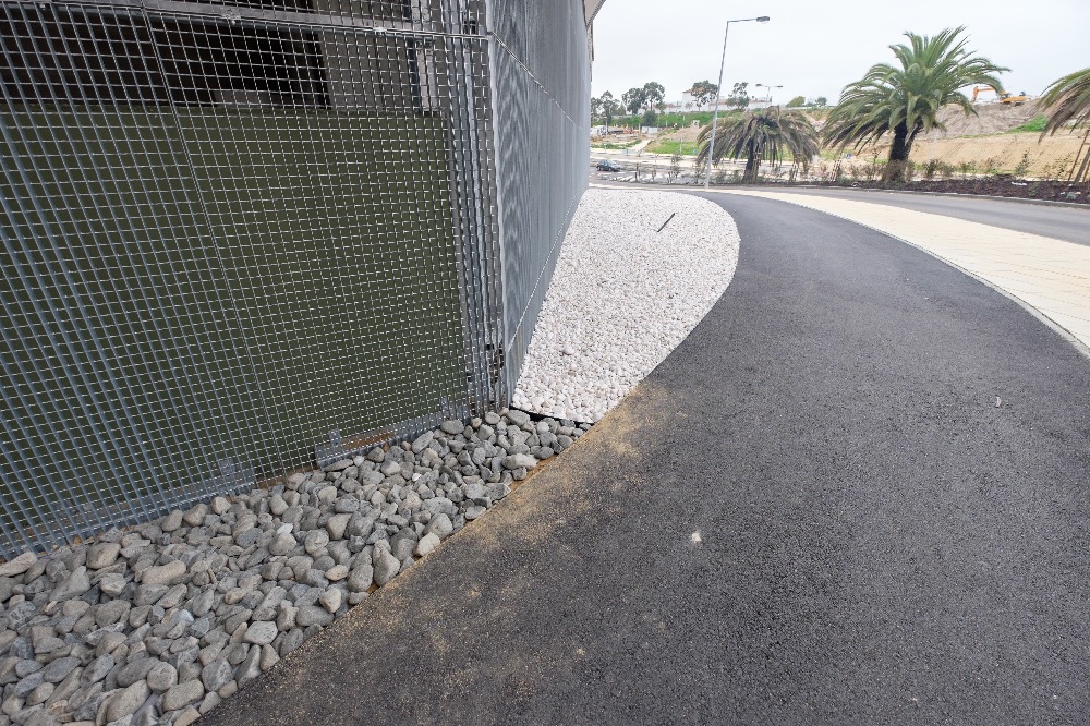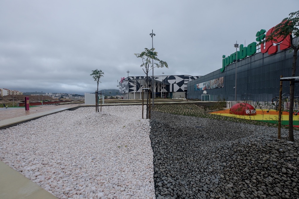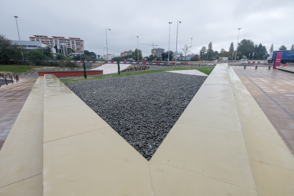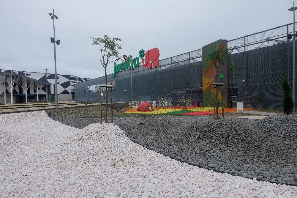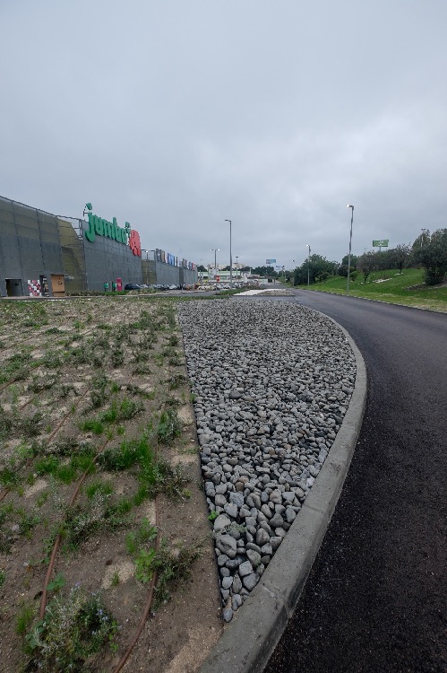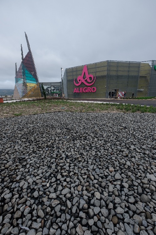 Recente Projeto fornecido para Centro Comercial Alegro shopping em Setúbal, perto de 320 toneladas de seixo rolado em Estremoz e Basalto (pedra preta) calibre-tamanho pedra referência 5/8 que serviu para revestir toda área circundante do edifício, espaços de jardim.